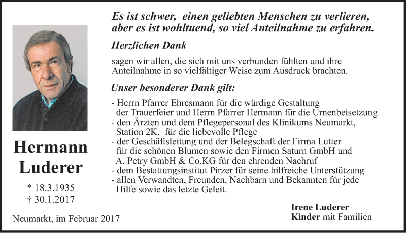 Hier finden Sie alle Traueranzeigen aus der Zeitung, die bisher für Hermann Luderer erschienen sind. Weitere Traueranzeigen, die in der Zeitung erscheinen, werden hier ebenfalls aufgelistet