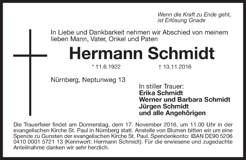 Hier finden Sie alle Traueranzeigen aus der Zeitung, die bisher für Hermann Schmidt erschienen sind. Weitere Traueranzeigen, die in der Zeitung erscheinen, werden hier ebenfalls aufgelistet