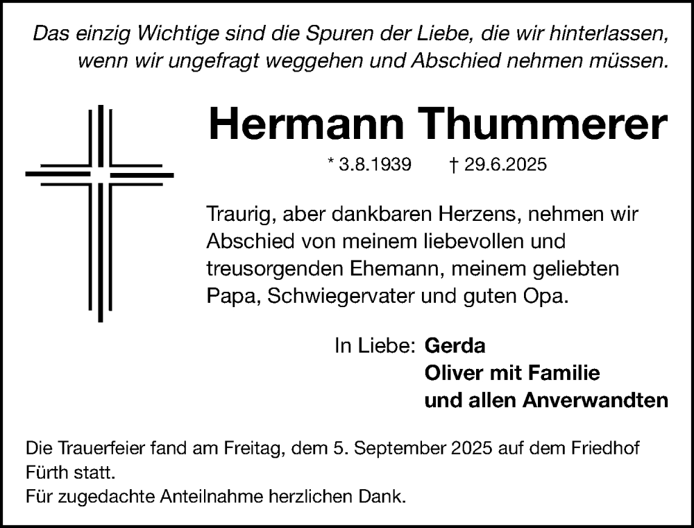 Hier finden Sie alle Traueranzeigen aus der Zeitung, die bisher für Hermann Thummerer erschienen sind. Weitere Traueranzeigen, die in der Zeitung erscheinen, werden hier ebenfalls aufgelistet