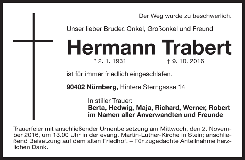 Hier finden Sie alle Traueranzeigen aus der Zeitung, die bisher für Hermann Trabert erschienen sind. Weitere Traueranzeigen, die in der Zeitung erscheinen, werden hier ebenfalls aufgelistet