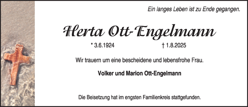Hier finden Sie alle Traueranzeigen aus der Zeitung, die bisher für Herta Ott-Engelmann erschienen sind. Weitere Traueranzeigen, die in der Zeitung erscheinen, werden hier ebenfalls aufgelistet