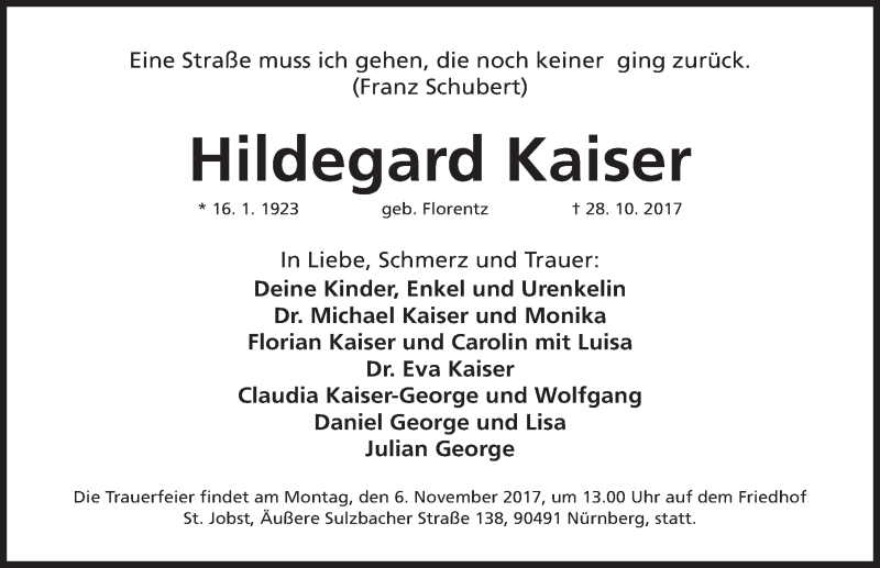 Hier finden Sie alle Traueranzeigen aus der Zeitung, die bisher für Hildegard Kaiser erschienen sind. Weitere Traueranzeigen, die in der Zeitung erscheinen, werden hier ebenfalls aufgelistet