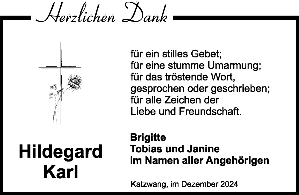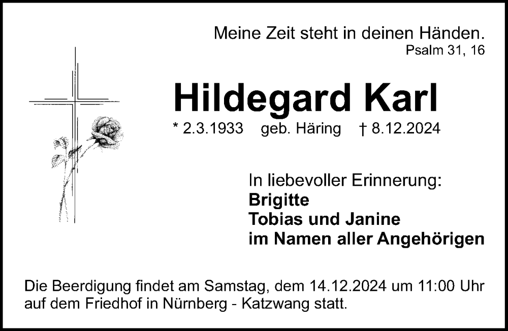 Hier finden Sie alle Traueranzeigen aus der Zeitung, die bisher für Hildegard Karl erschienen sind. Weitere Traueranzeigen, die in der Zeitung erscheinen, werden hier ebenfalls aufgelistet