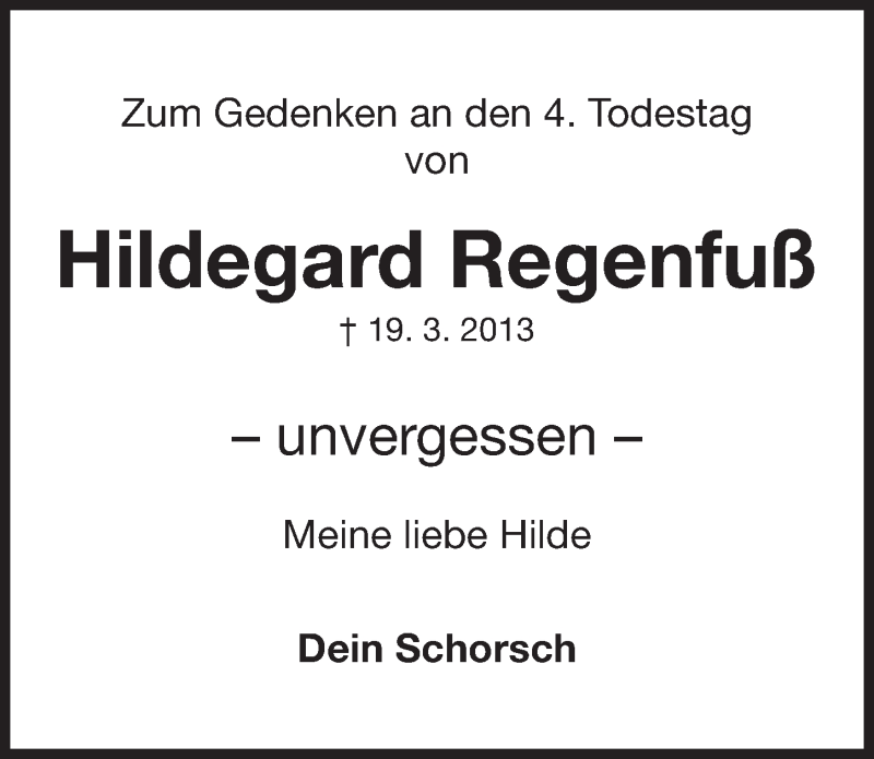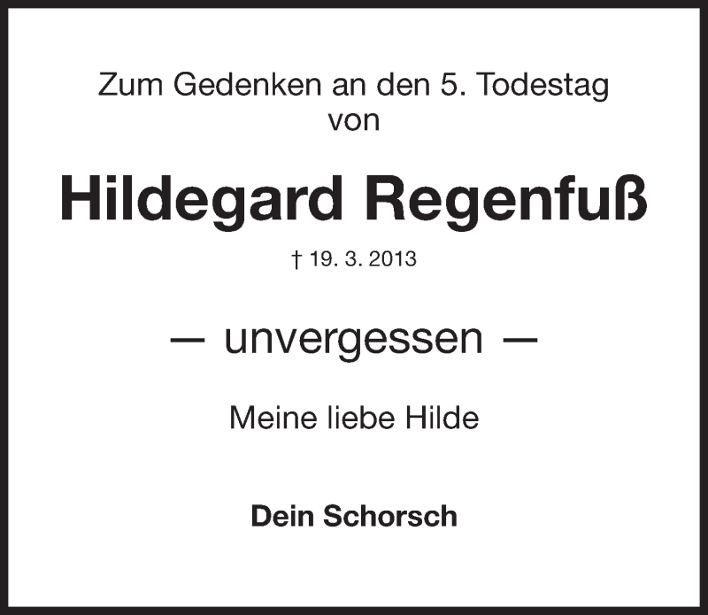 Hier finden Sie alle Traueranzeigen aus der Zeitung, die bisher für Hildegard Regenfuß erschienen sind. Weitere Traueranzeigen, die in der Zeitung erscheinen, werden hier ebenfalls aufgelistet