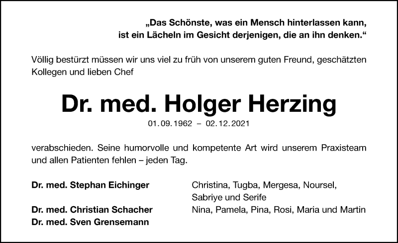 Hier finden Sie alle Traueranzeigen aus der Zeitung, die bisher für Holger Herzing erschienen sind. Weitere Traueranzeigen, die in der Zeitung erscheinen, werden hier ebenfalls aufgelistet