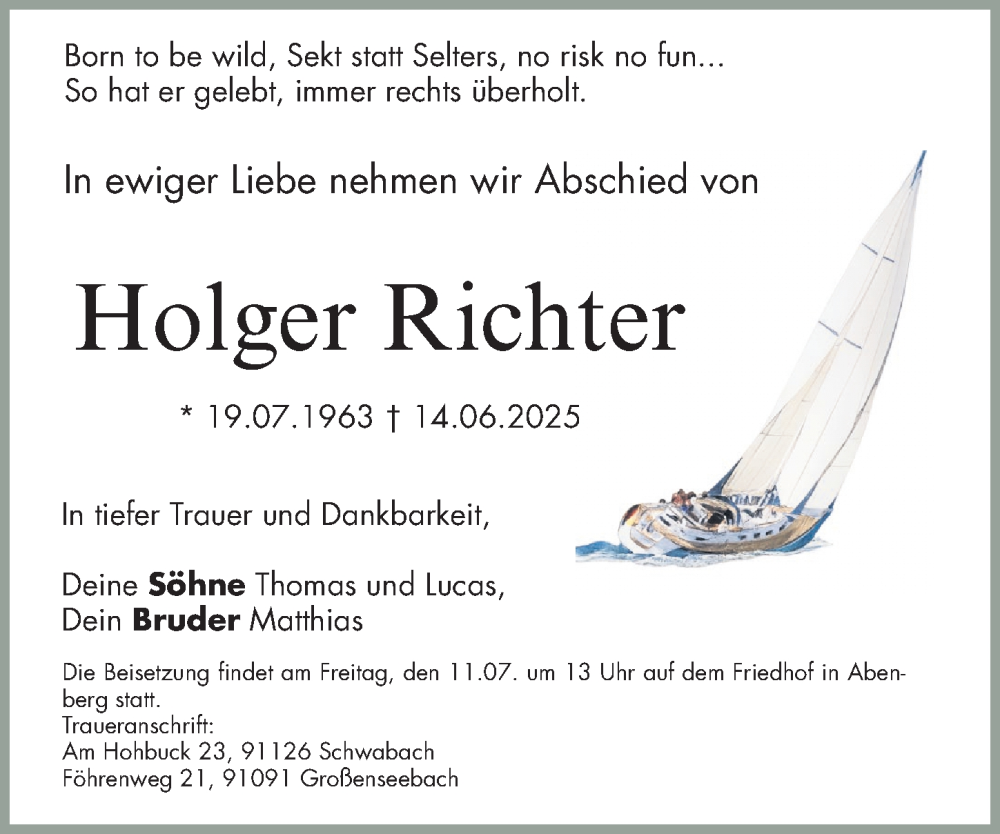 Hier finden Sie alle Traueranzeigen aus der Zeitung, die bisher für Holger Richter erschienen sind. Weitere Traueranzeigen, die in der Zeitung erscheinen, werden hier ebenfalls aufgelistet