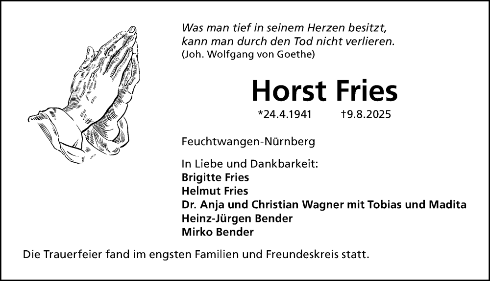 Hier finden Sie alle Traueranzeigen aus der Zeitung, die bisher für Horst Fries erschienen sind. Weitere Traueranzeigen, die in der Zeitung erscheinen, werden hier ebenfalls aufgelistet