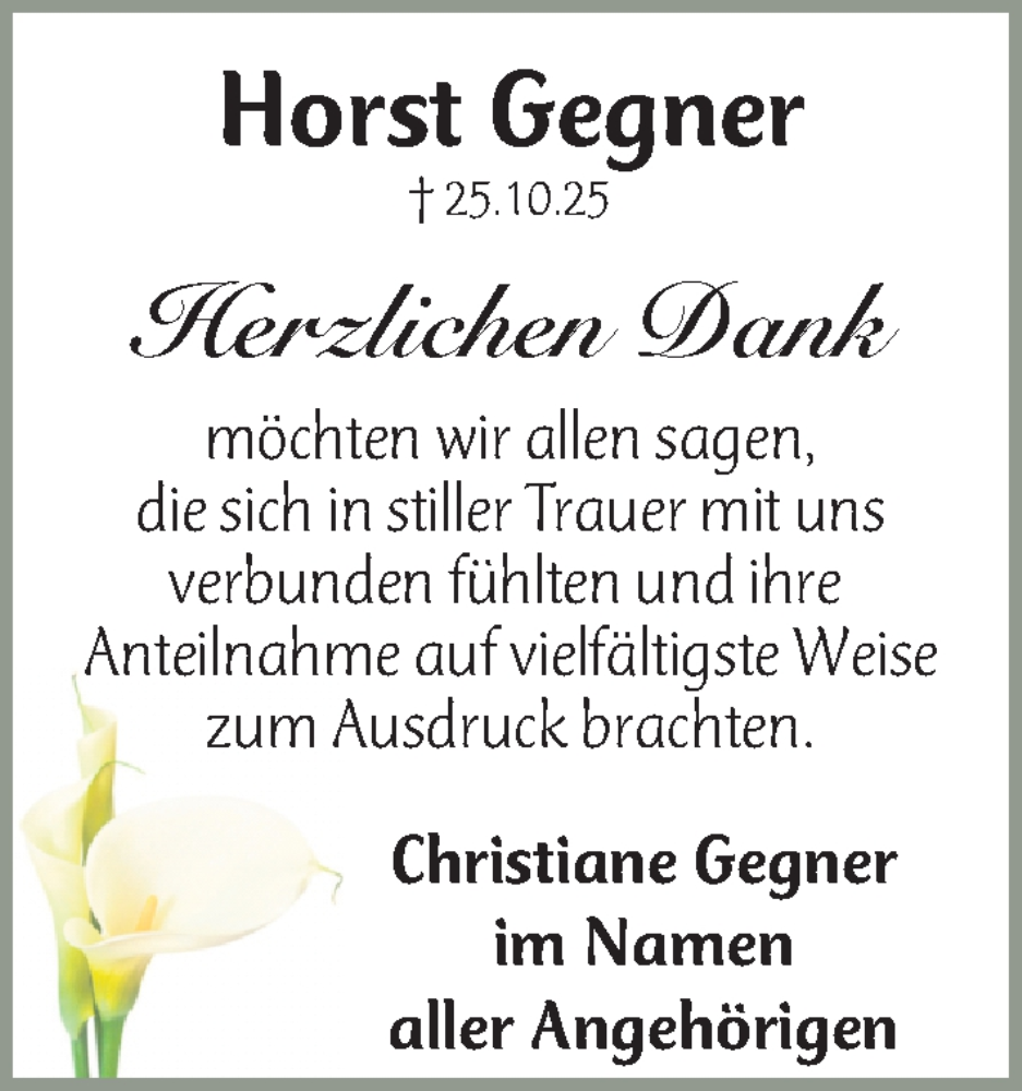 Hier finden Sie alle Traueranzeigen aus der Zeitung, die bisher für Horst Gegner erschienen sind. Weitere Traueranzeigen, die in der Zeitung erscheinen, werden hier ebenfalls aufgelistet