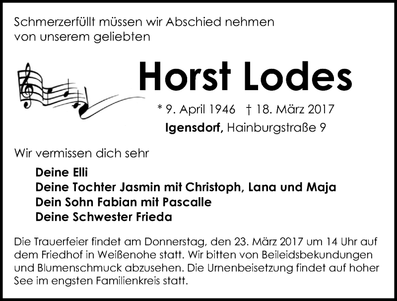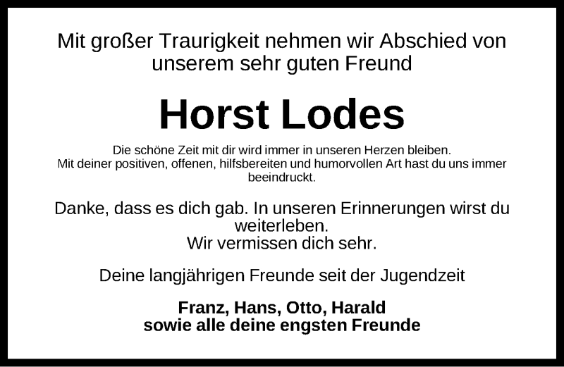 Hier finden Sie alle Traueranzeigen aus der Zeitung, die bisher für Horst Lodes erschienen sind. Weitere Traueranzeigen, die in der Zeitung erscheinen, werden hier ebenfalls aufgelistet