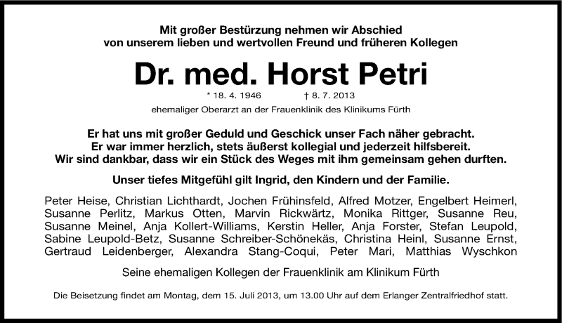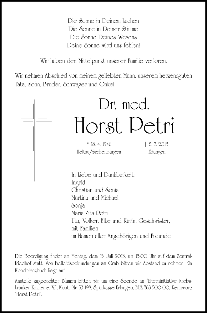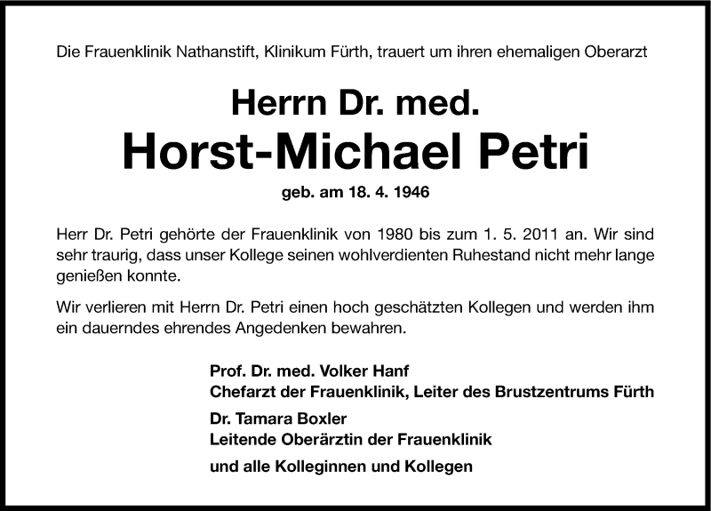 Hier finden Sie alle Traueranzeigen aus der Zeitung, die bisher für Horst-Michael Petri erschienen sind. Weitere Traueranzeigen, die in der Zeitung erscheinen, werden hier ebenfalls aufgelistet