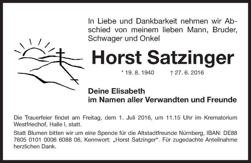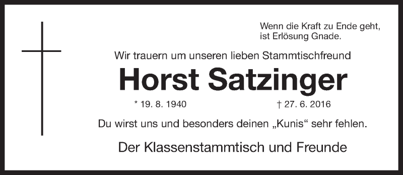 Hier finden Sie alle Traueranzeigen aus der Zeitung, die bisher für Horst Satzinger erschienen sind. Weitere Traueranzeigen, die in der Zeitung erscheinen, werden hier ebenfalls aufgelistet