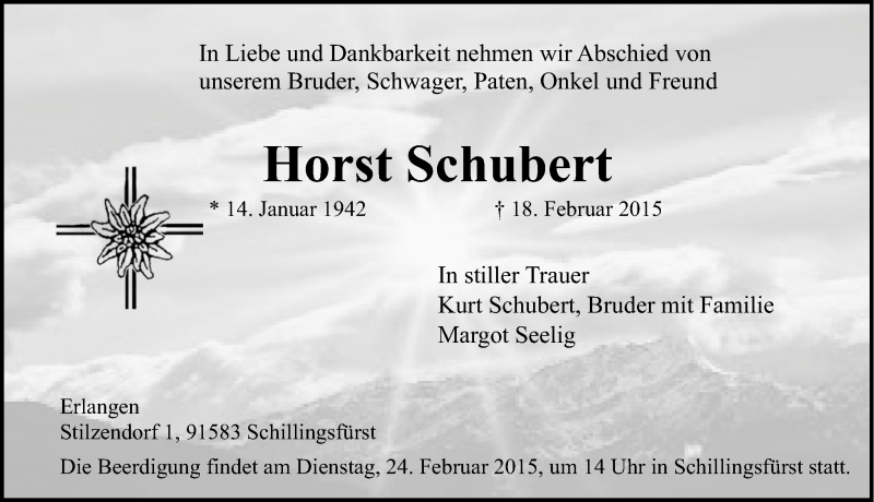 Hier finden Sie alle Traueranzeigen aus der Zeitung, die bisher für Horst Schubert erschienen sind. Weitere Traueranzeigen, die in der Zeitung erscheinen, werden hier ebenfalls aufgelistet