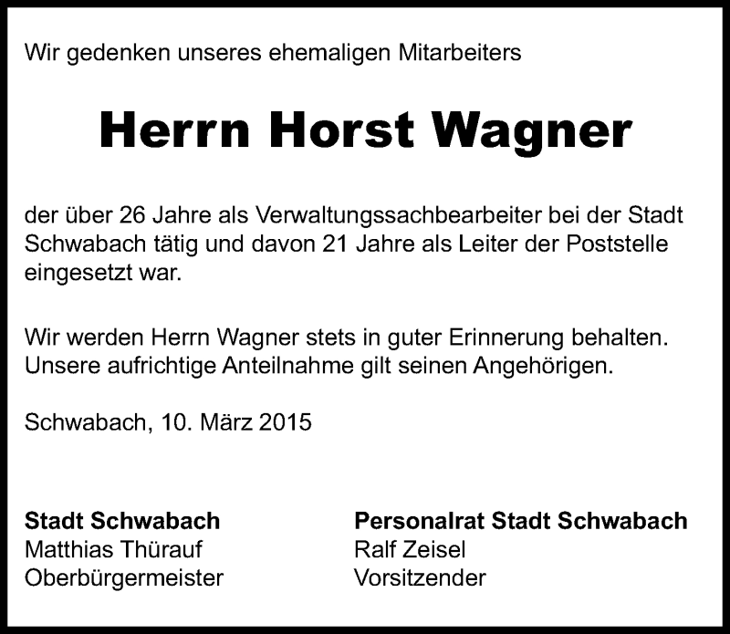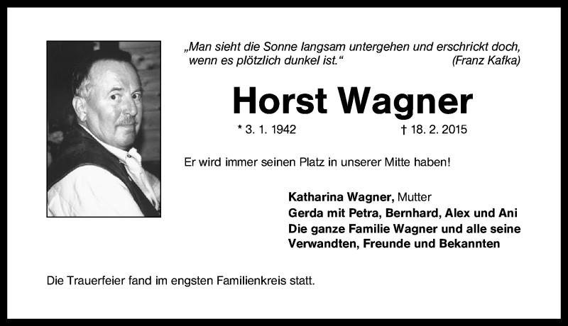 Hier finden Sie alle Traueranzeigen aus der Zeitung, die bisher für Horst Wagner erschienen sind. Weitere Traueranzeigen, die in der Zeitung erscheinen, werden hier ebenfalls aufgelistet