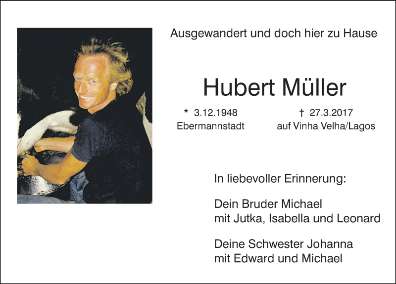 Hier finden Sie alle Traueranzeigen aus der Zeitung, die bisher für Hubert Müller erschienen sind. Weitere Traueranzeigen, die in der Zeitung erscheinen, werden hier ebenfalls aufgelistet