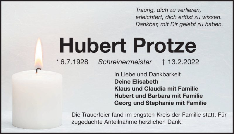 Hier finden Sie alle Traueranzeigen aus der Zeitung, die bisher für Hubert Protze erschienen sind. Weitere Traueranzeigen, die in der Zeitung erscheinen, werden hier ebenfalls aufgelistet