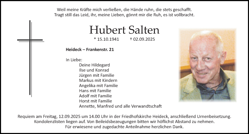Hier finden Sie alle Traueranzeigen aus der Zeitung, die bisher für Hubert Salten erschienen sind. Weitere Traueranzeigen, die in der Zeitung erscheinen, werden hier ebenfalls aufgelistet