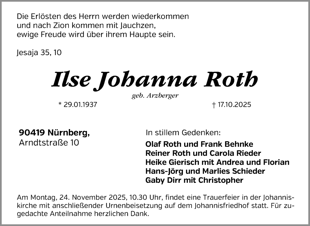 Hier finden Sie alle Traueranzeigen aus der Zeitung, die bisher für Ilse Johanna Roth erschienen sind. Weitere Traueranzeigen, die in der Zeitung erscheinen, werden hier ebenfalls aufgelistet