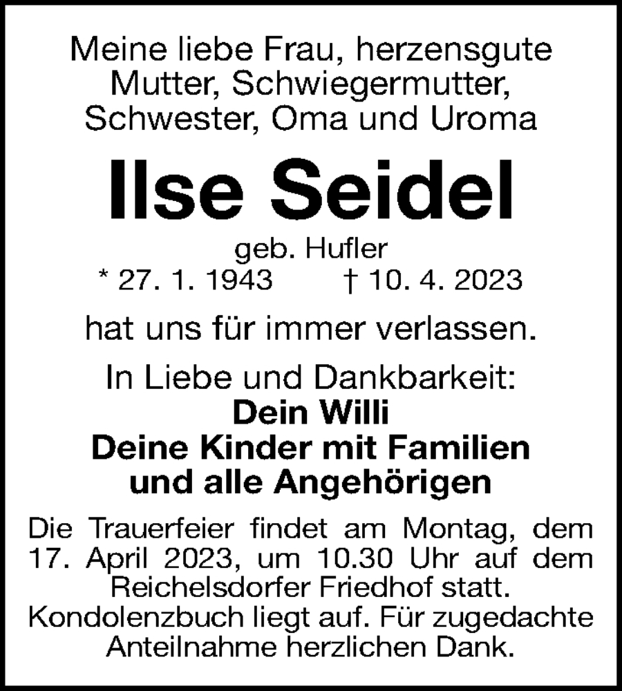 Hier finden Sie alle Traueranzeigen aus der Zeitung, die bisher für Ilse Seidel erschienen sind. Weitere Traueranzeigen, die in der Zeitung erscheinen, werden hier ebenfalls aufgelistet
