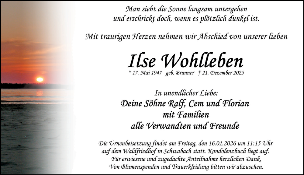 Hier finden Sie alle Traueranzeigen aus der Zeitung, die bisher für Ilse Wohlleben erschienen sind. Weitere Traueranzeigen, die in der Zeitung erscheinen, werden hier ebenfalls aufgelistet