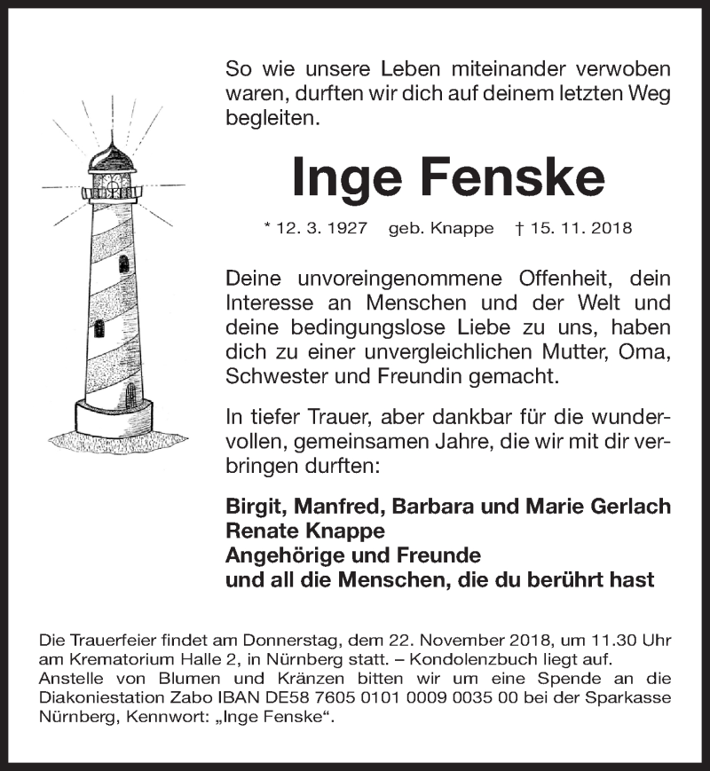 Hier finden Sie alle Traueranzeigen aus der Zeitung, die bisher für Inge Fenske erschienen sind. Weitere Traueranzeigen, die in der Zeitung erscheinen, werden hier ebenfalls aufgelistet
