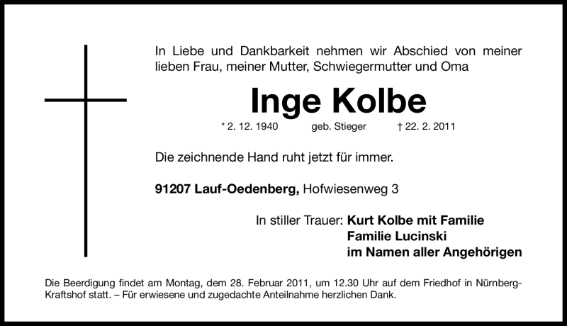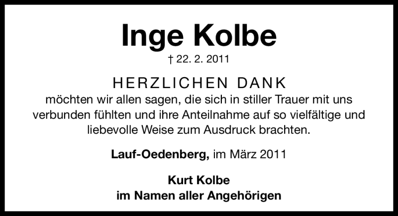 Hier finden Sie alle Traueranzeigen aus der Zeitung, die bisher für Inge Kolbe erschienen sind. Weitere Traueranzeigen, die in der Zeitung erscheinen, werden hier ebenfalls aufgelistet