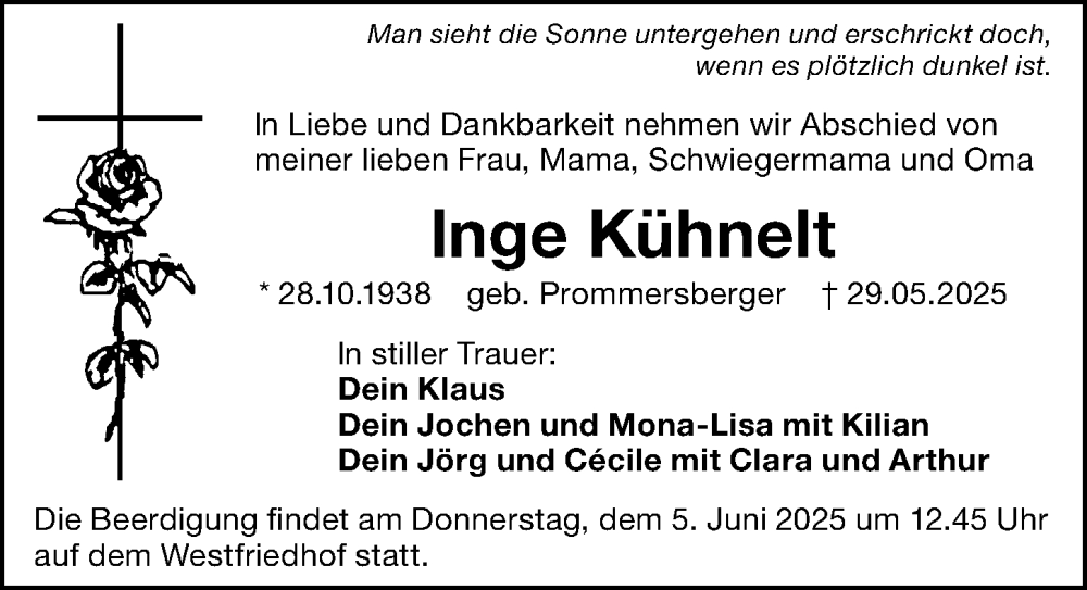 Hier finden Sie alle Traueranzeigen aus der Zeitung, die bisher für Inge Kühnelt erschienen sind. Weitere Traueranzeigen, die in der Zeitung erscheinen, werden hier ebenfalls aufgelistet