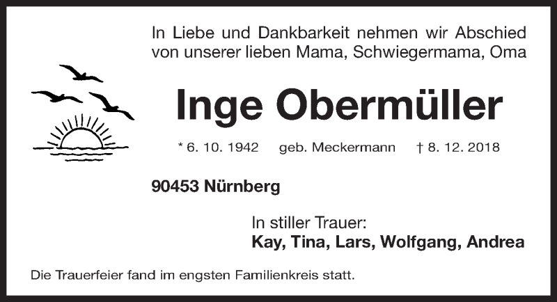 Hier finden Sie alle Traueranzeigen aus der Zeitung, die bisher für Inge Obermüller erschienen sind. Weitere Traueranzeigen, die in der Zeitung erscheinen, werden hier ebenfalls aufgelistet