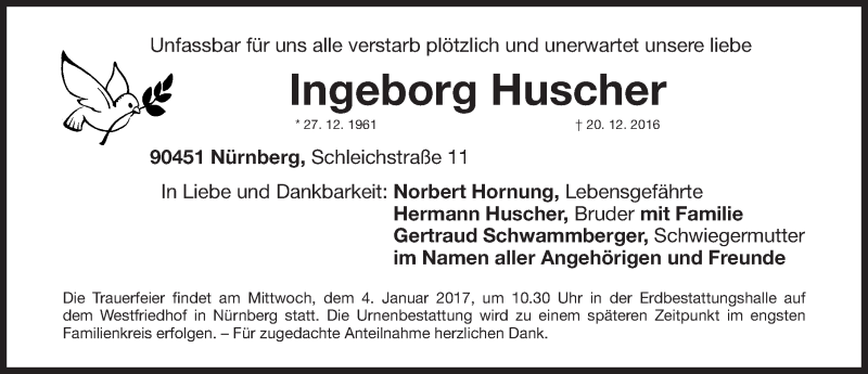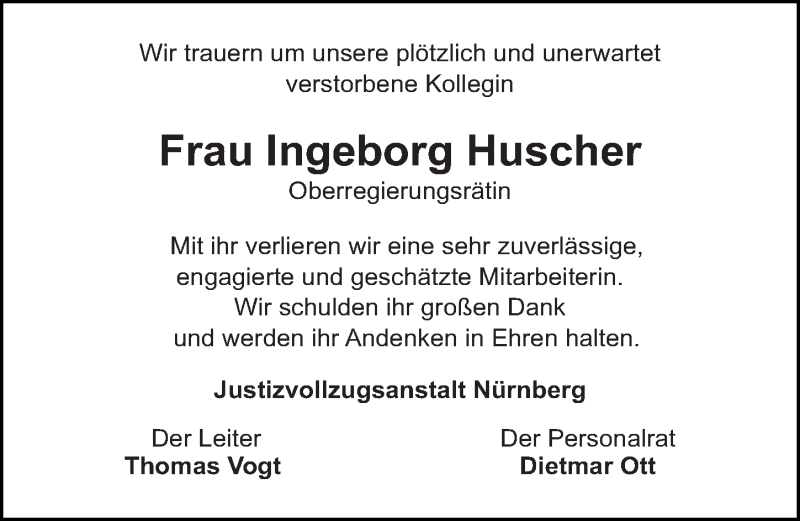Hier finden Sie alle Traueranzeigen aus der Zeitung, die bisher für Ingeborg Huscher erschienen sind. Weitere Traueranzeigen, die in der Zeitung erscheinen, werden hier ebenfalls aufgelistet