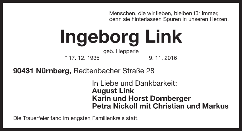 Hier finden Sie alle Traueranzeigen aus der Zeitung, die bisher für Ingeborg Link erschienen sind. Weitere Traueranzeigen, die in der Zeitung erscheinen, werden hier ebenfalls aufgelistet