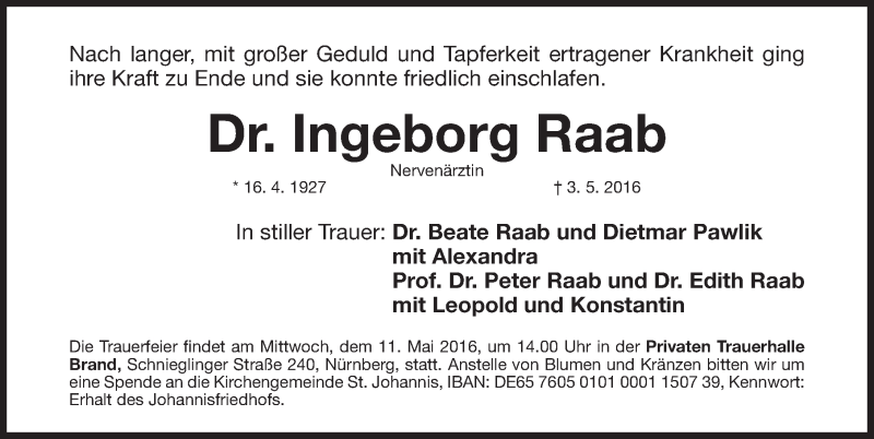 Hier finden Sie alle Traueranzeigen aus der Zeitung, die bisher für Ingeborg Raab erschienen sind. Weitere Traueranzeigen, die in der Zeitung erscheinen, werden hier ebenfalls aufgelistet