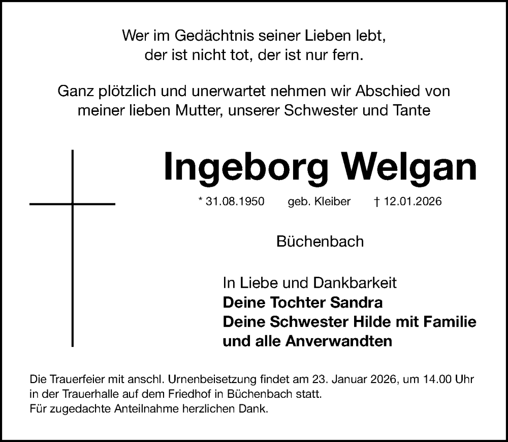 Hier finden Sie alle Traueranzeigen aus der Zeitung, die bisher für Ingeborg Welgan erschienen sind. Weitere Traueranzeigen, die in der Zeitung erscheinen, werden hier ebenfalls aufgelistet