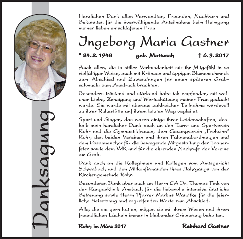 Hier finden Sie alle Traueranzeigen aus der Zeitung, die bisher für Ingeborg Maria Gastner erschienen sind. Weitere Traueranzeigen, die in der Zeitung erscheinen, werden hier ebenfalls aufgelistet