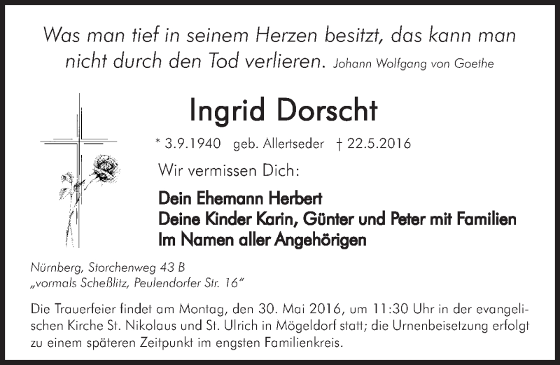 Hier finden Sie alle Traueranzeigen aus der Zeitung, die bisher für Ingrid Dorscht erschienen sind. Weitere Traueranzeigen, die in der Zeitung erscheinen, werden hier ebenfalls aufgelistet