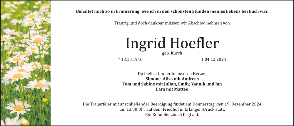 Hier finden Sie alle Traueranzeigen aus der Zeitung, die bisher für Ingrid Hoefler erschienen sind. Weitere Traueranzeigen, die in der Zeitung erscheinen, werden hier ebenfalls aufgelistet