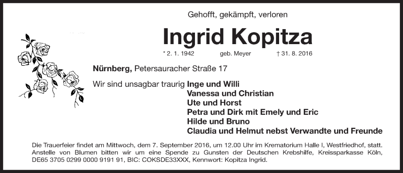 Hier finden Sie alle Traueranzeigen aus der Zeitung, die bisher für Ingrid Kopitza erschienen sind. Weitere Traueranzeigen, die in der Zeitung erscheinen, werden hier ebenfalls aufgelistet