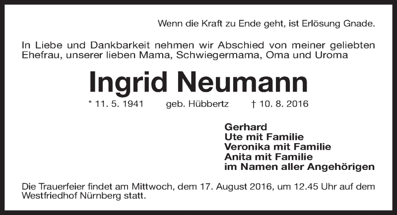 Hier finden Sie alle Traueranzeigen aus der Zeitung, die bisher für Ingrid Neumann erschienen sind. Weitere Traueranzeigen, die in der Zeitung erscheinen, werden hier ebenfalls aufgelistet