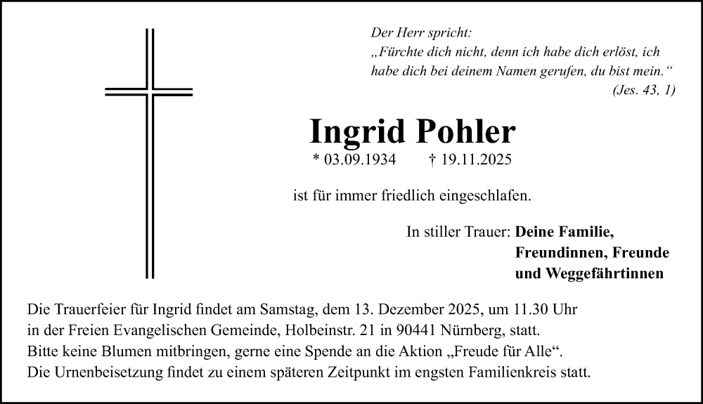 Hier finden Sie alle Traueranzeigen aus der Zeitung, die bisher für Ingrid Pohler erschienen sind. Weitere Traueranzeigen, die in der Zeitung erscheinen, werden hier ebenfalls aufgelistet