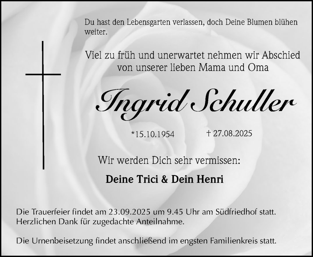 Hier finden Sie alle Traueranzeigen aus der Zeitung, die bisher für Ingrid Schuller erschienen sind. Weitere Traueranzeigen, die in der Zeitung erscheinen, werden hier ebenfalls aufgelistet