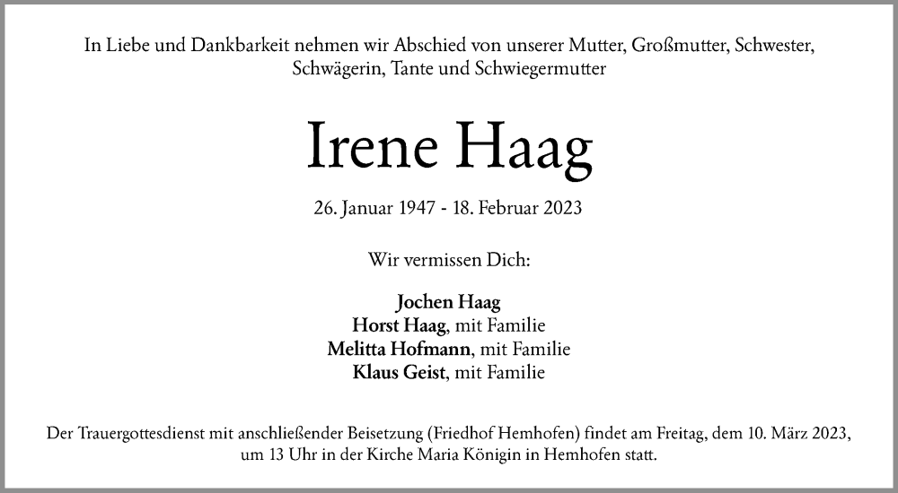 Hier finden Sie alle Traueranzeigen aus der Zeitung, die bisher für Irene Haag erschienen sind. Weitere Traueranzeigen, die in der Zeitung erscheinen, werden hier ebenfalls aufgelistet