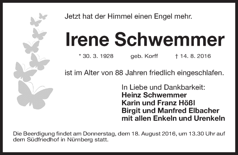 Hier finden Sie alle Traueranzeigen aus der Zeitung, die bisher für Irene Schwemmer erschienen sind. Weitere Traueranzeigen, die in der Zeitung erscheinen, werden hier ebenfalls aufgelistet