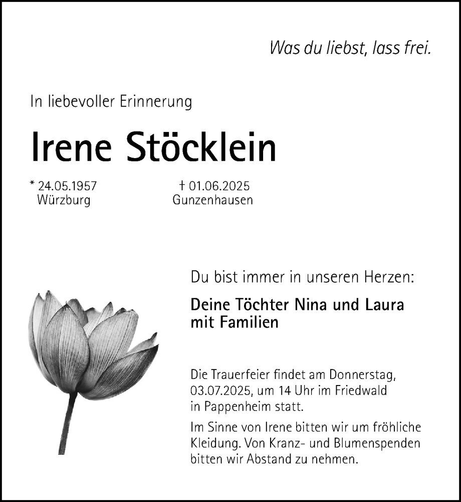 Hier finden Sie alle Traueranzeigen aus der Zeitung, die bisher für Irene Stöcklein erschienen sind. Weitere Traueranzeigen, die in der Zeitung erscheinen, werden hier ebenfalls aufgelistet