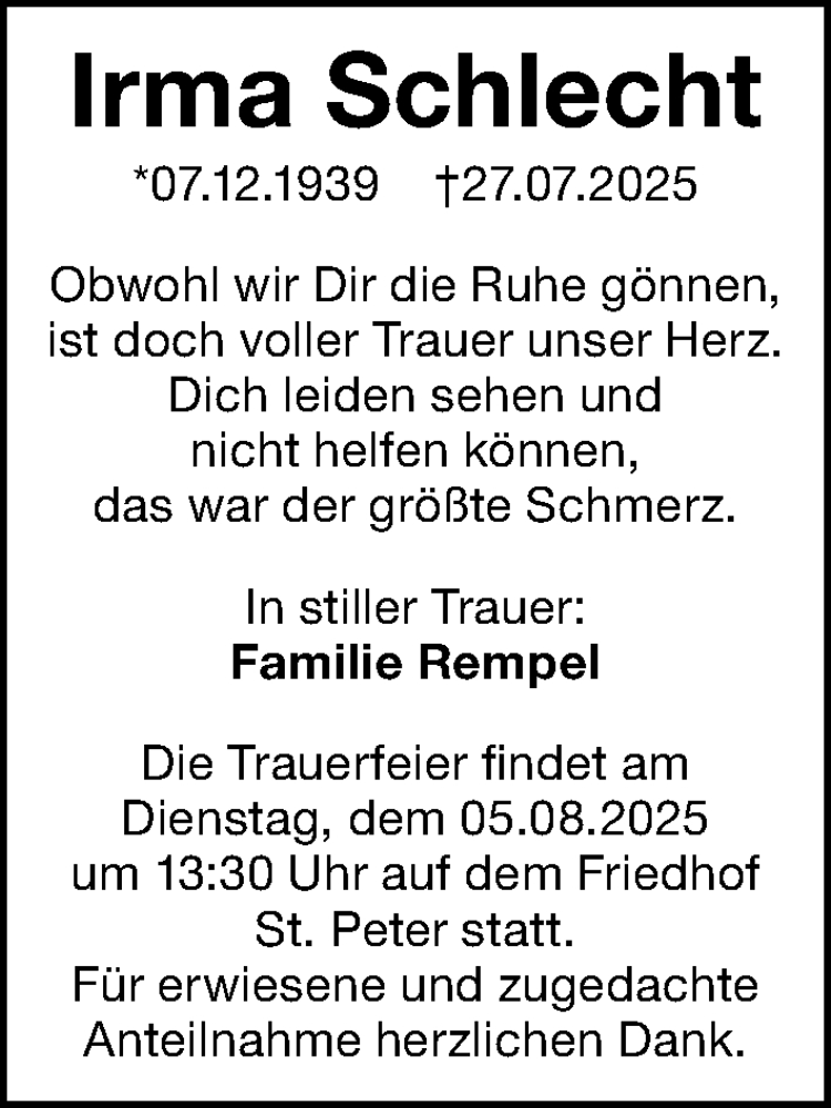 Hier finden Sie alle Traueranzeigen aus der Zeitung, die bisher für Irma Schlecht erschienen sind. Weitere Traueranzeigen, die in der Zeitung erscheinen, werden hier ebenfalls aufgelistet