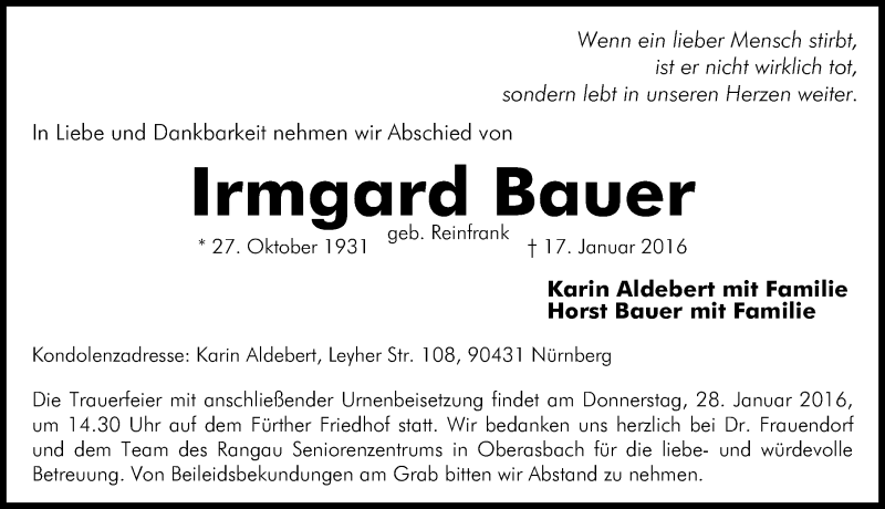Hier finden Sie alle Traueranzeigen aus der Zeitung, die bisher für Irmgard Bauer erschienen sind. Weitere Traueranzeigen, die in der Zeitung erscheinen, werden hier ebenfalls aufgelistet