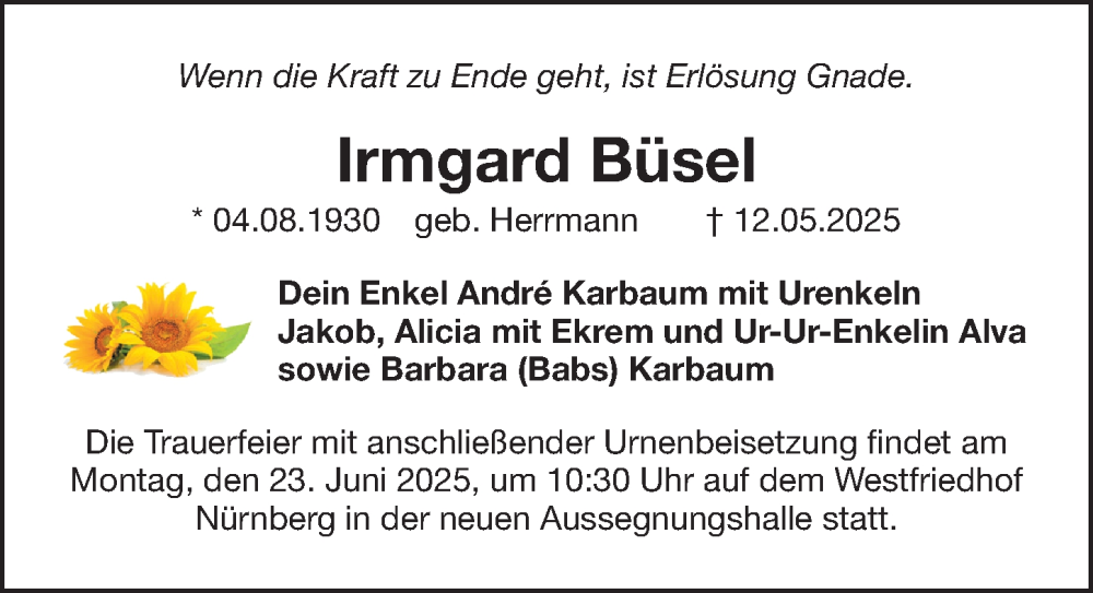 Hier finden Sie alle Traueranzeigen aus der Zeitung, die bisher für Irmgard Büsel erschienen sind. Weitere Traueranzeigen, die in der Zeitung erscheinen, werden hier ebenfalls aufgelistet