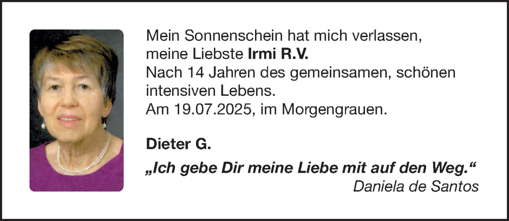 Hier finden Sie alle Traueranzeigen aus der Zeitung, die bisher für Irmi erschienen sind. Weitere Traueranzeigen, die in der Zeitung erscheinen, werden hier ebenfalls aufgelistet