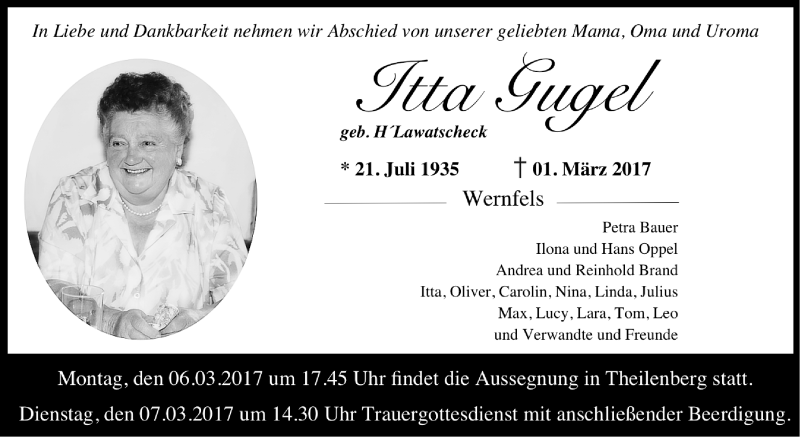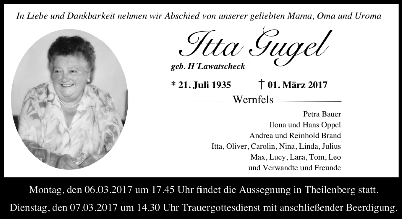 Hier finden Sie alle Traueranzeigen aus der Zeitung, die bisher für Itta Gugel erschienen sind. Weitere Traueranzeigen, die in der Zeitung erscheinen, werden hier ebenfalls aufgelistet