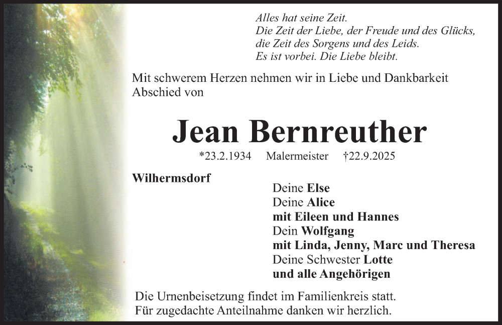 Hier finden Sie alle Traueranzeigen aus der Zeitung, die bisher für Jean Bernreuther erschienen sind. Weitere Traueranzeigen, die in der Zeitung erscheinen, werden hier ebenfalls aufgelistet