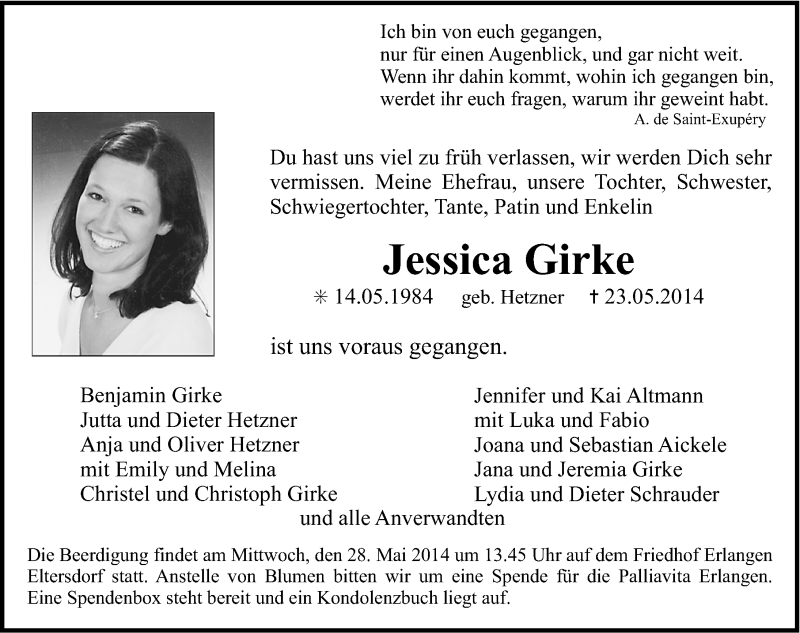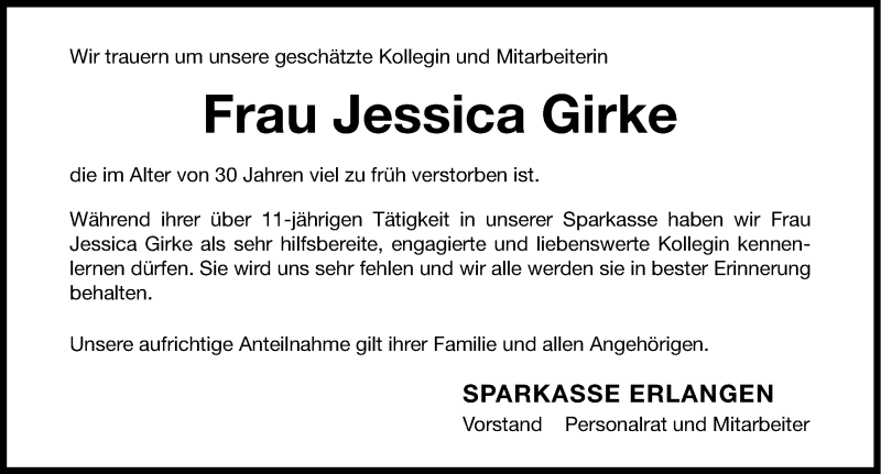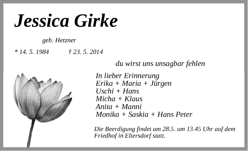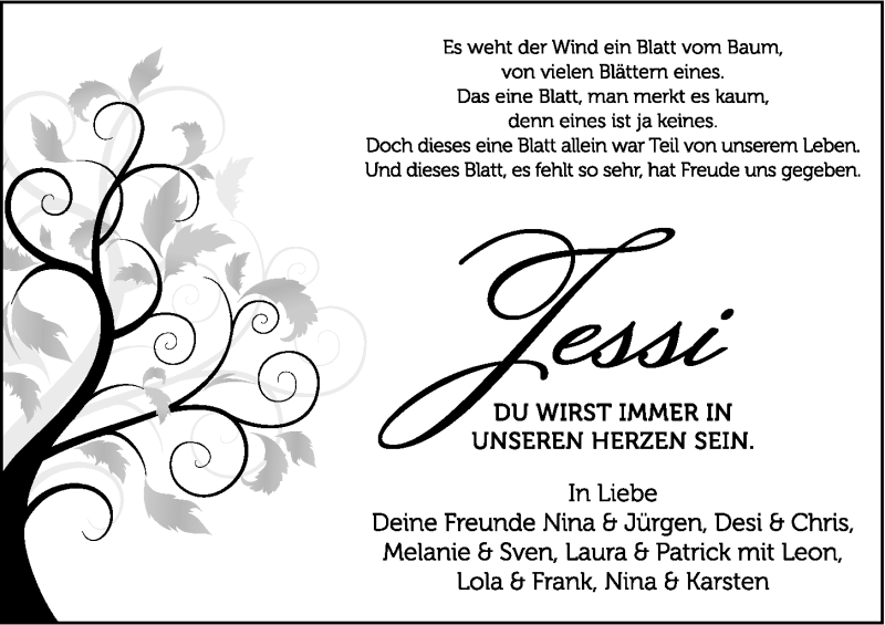 Hier finden Sie alle Traueranzeigen aus der Zeitung, die bisher für Jessica Girke erschienen sind. Weitere Traueranzeigen, die in der Zeitung erscheinen, werden hier ebenfalls aufgelistet