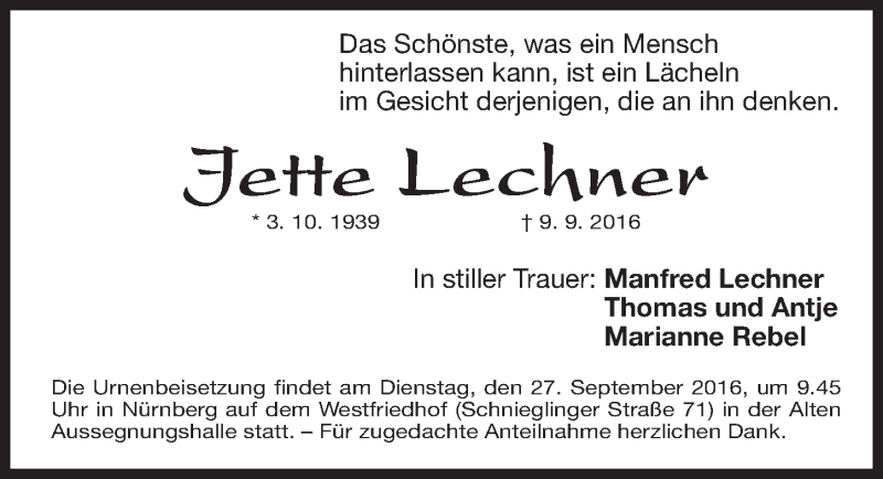 Hier finden Sie alle Traueranzeigen aus der Zeitung, die bisher für Jette Lechner erschienen sind. Weitere Traueranzeigen, die in der Zeitung erscheinen, werden hier ebenfalls aufgelistet