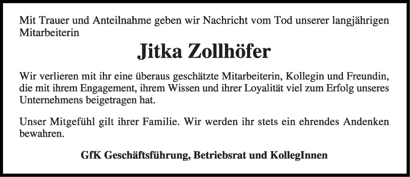 Hier finden Sie alle Traueranzeigen aus der Zeitung, die bisher für Jitka Zollhöfer erschienen sind. Weitere Traueranzeigen, die in der Zeitung erscheinen, werden hier ebenfalls aufgelistet